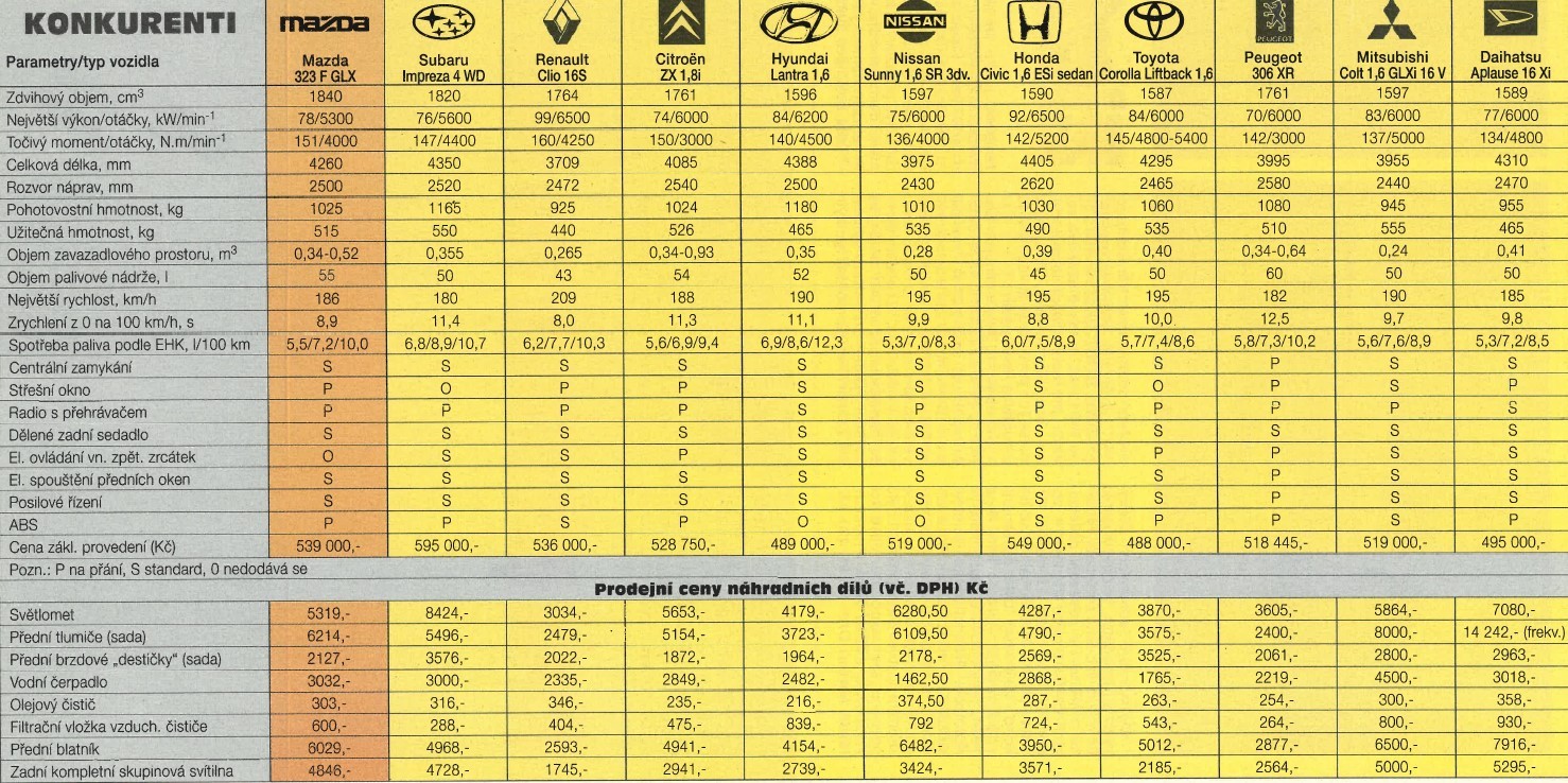 Porovnání cen 323F s konkurencí v roce 1994. Toho času byla již výběhovým modelem a nahrazena futuristickým typem BA.[5]